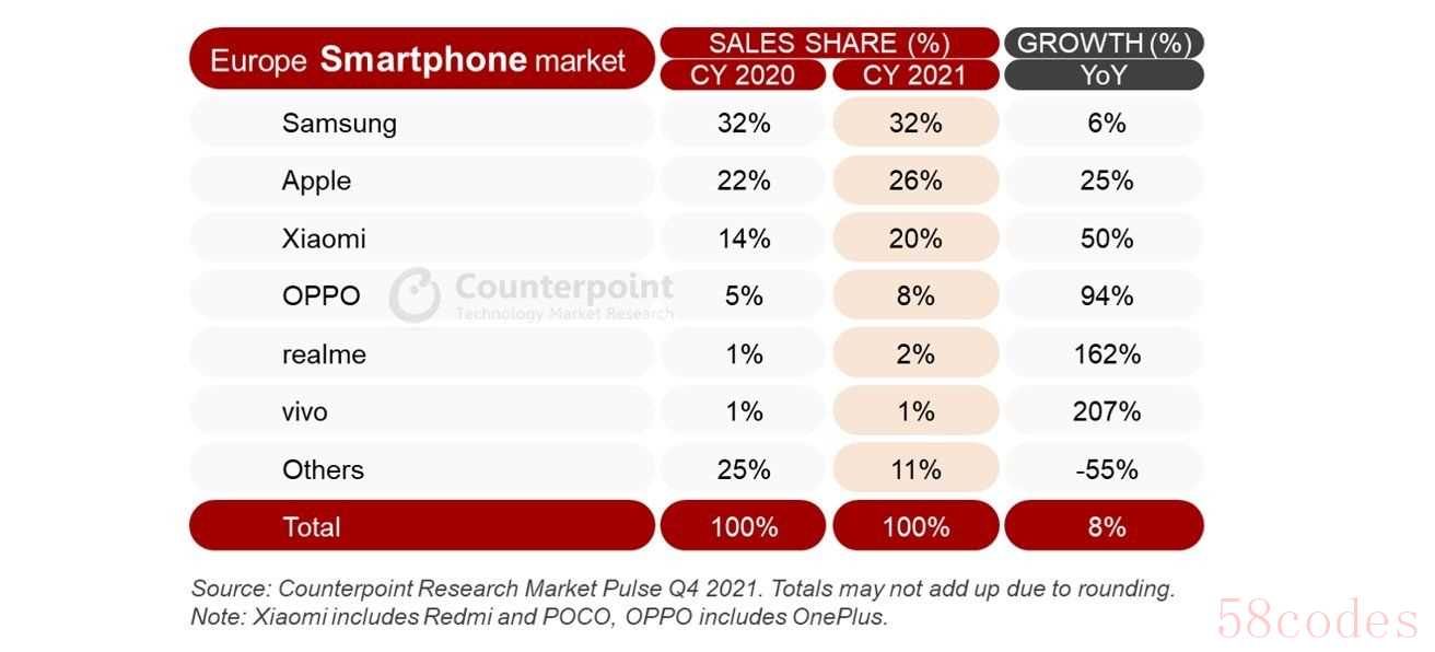 根据Counterpoint Research的数据显示,去年OPPO、realme和vivo都在欧洲市场取得了非常不错的增长。凭借着优惠的价格,realme成功在成功在欧洲市场打下了根基,尤其是在东欧(如波兰、捷克、乌克兰)和对价格敏感的西欧(如意大利、希腊和西班牙)。