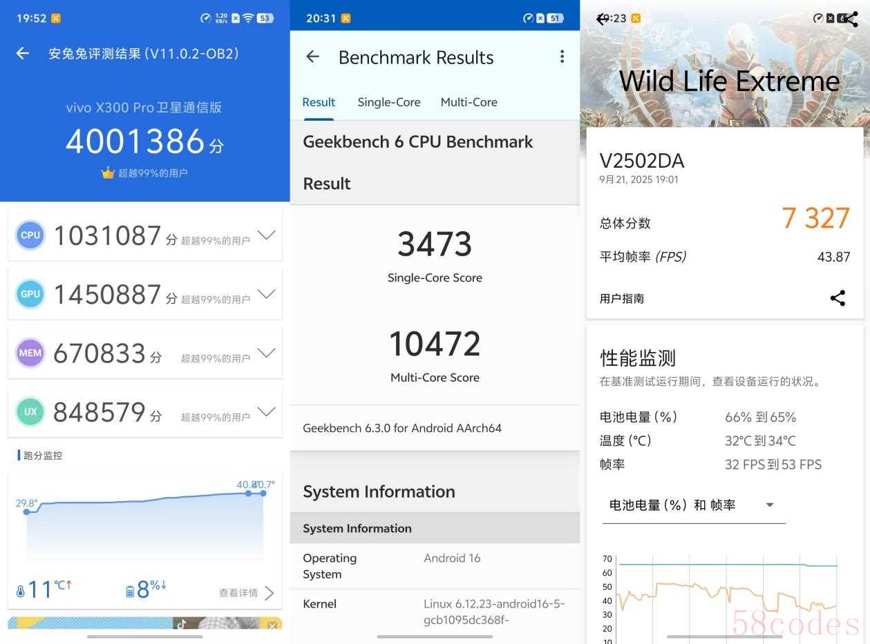 为了进一步了解天玑9500的性能表现,我们使用相关性能测试软件进行了跑分测试:安兔兔V11跑分突破400万分;Geekbench6单核3473分、多核10472分;3DMarkWild Life Extreme 7327分。可以说vivo X300 Pro的性能已经稳坐当前安卓阵营第一梯队。