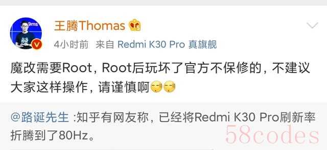 对于魔改高刷,Redmi产品总监王腾表示,魔改需要root,root后玩坏了官方不保修,需要谨慎操作。