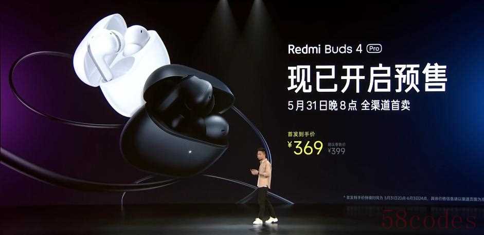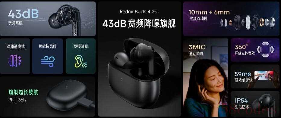 介绍完手机,红米还为我们带来一款红米Buds 4 Pro,采用入耳式设计,拥有43dB宽频降噪、智能抗风噪、360°环绕立体声、59ms超低延迟、双动圈单元HIFI、 5.3蓝牙、双设备智能连接、36小时续航等。