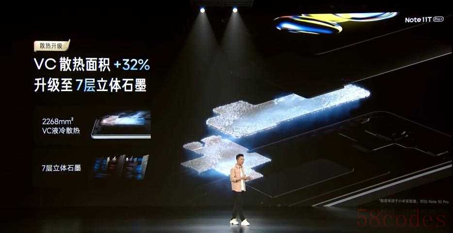 聊完了性能,红米Note11T Pro系列的散热也不能落下,它由上代3层石墨升级至旗舰级7层立体石墨散热,搭载铜VC液冷散热,拥有旗舰级2268mm²散热面积。