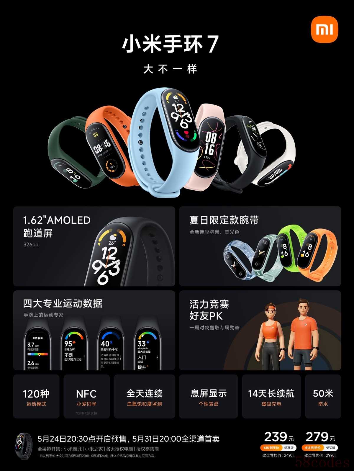 小米手环7,1.62 英寸视网膜级AMOLED全面屏,可视面积增加 25%、支持息屏显示,拥有13g重量,180mAh大电池容量、专业睡眠跟踪、100+运动模式专业运动效果评估、丰富主题表盘、全天血氧饱和度监测、小爱同学语音助手、50米深度防水。