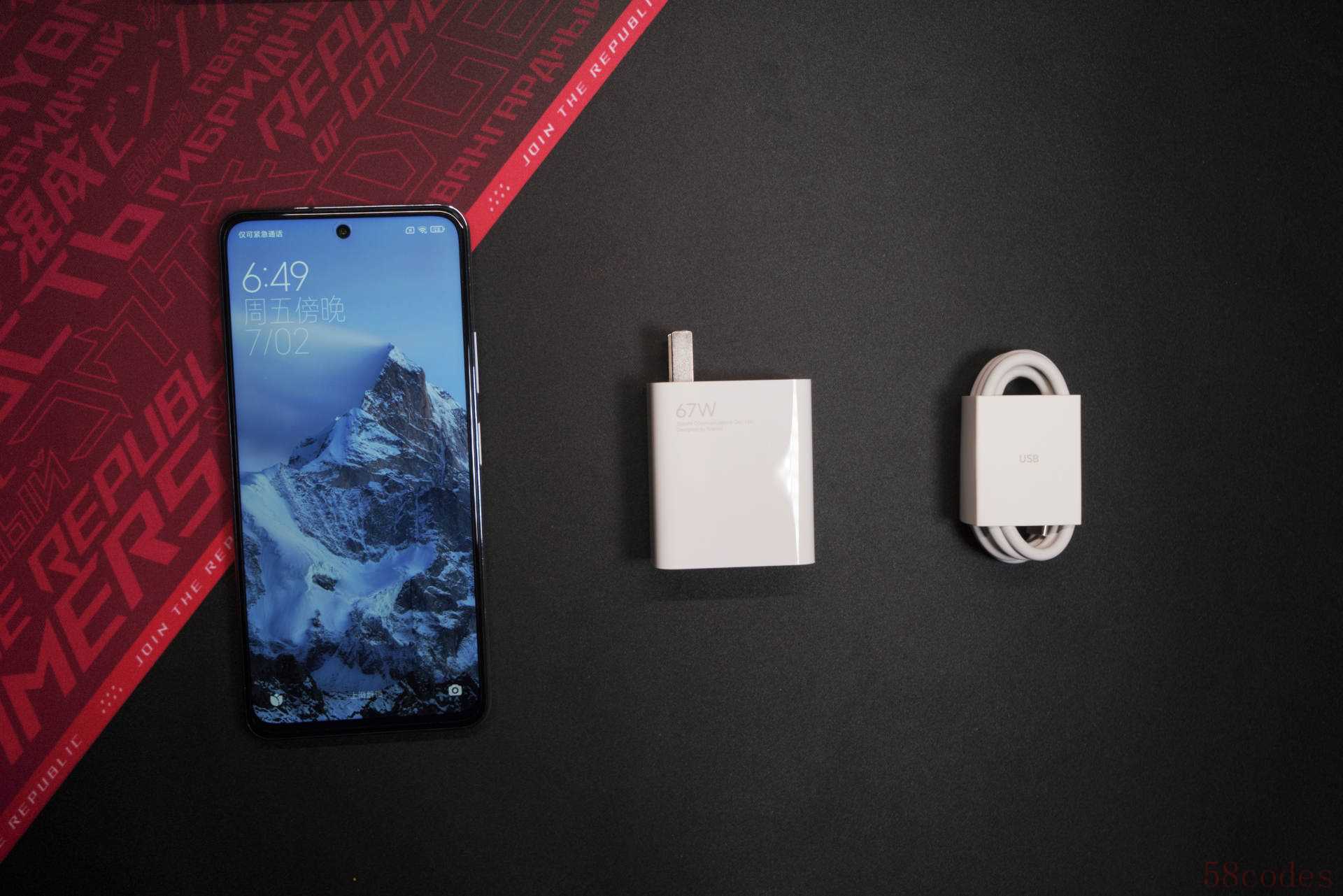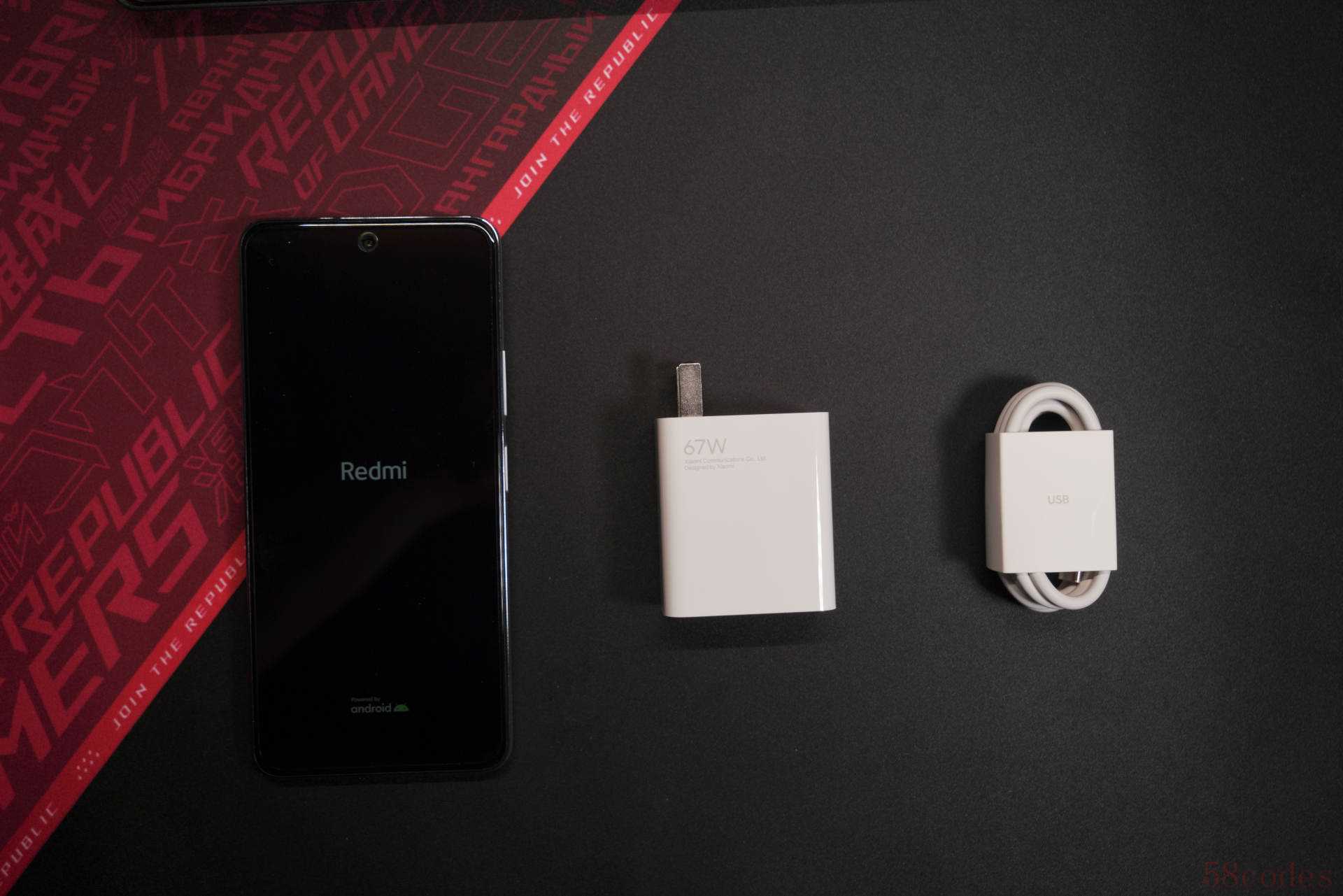 在下一层就可以拿出电源和数据线,电源为67W充电,实测为QC3.0协议,手机开机时会显示Redmi和安卓的标志