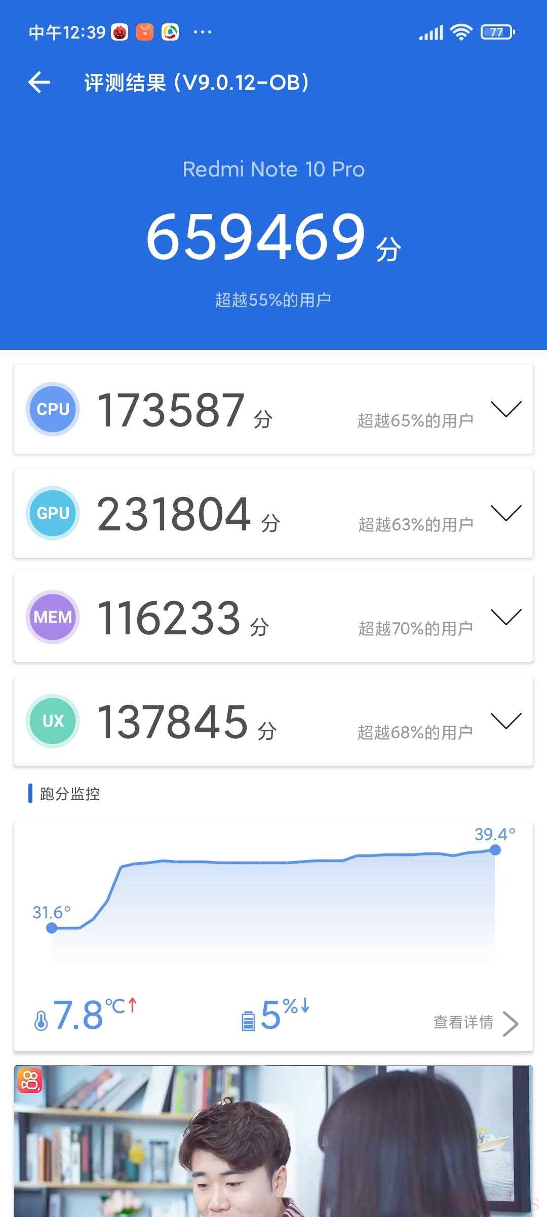 安兔兔跑分这块,总分为659469分,我对比了之前的IQOO7,CPU的差距不大,但GPU差距还是有一些的,MEM和UX的分数是反超IQOO7的,.也就是内存还有视频解码这方面是要比IQOO7好的,Note10PRO不亏是一款看视频的手机,也正好符合我的要求