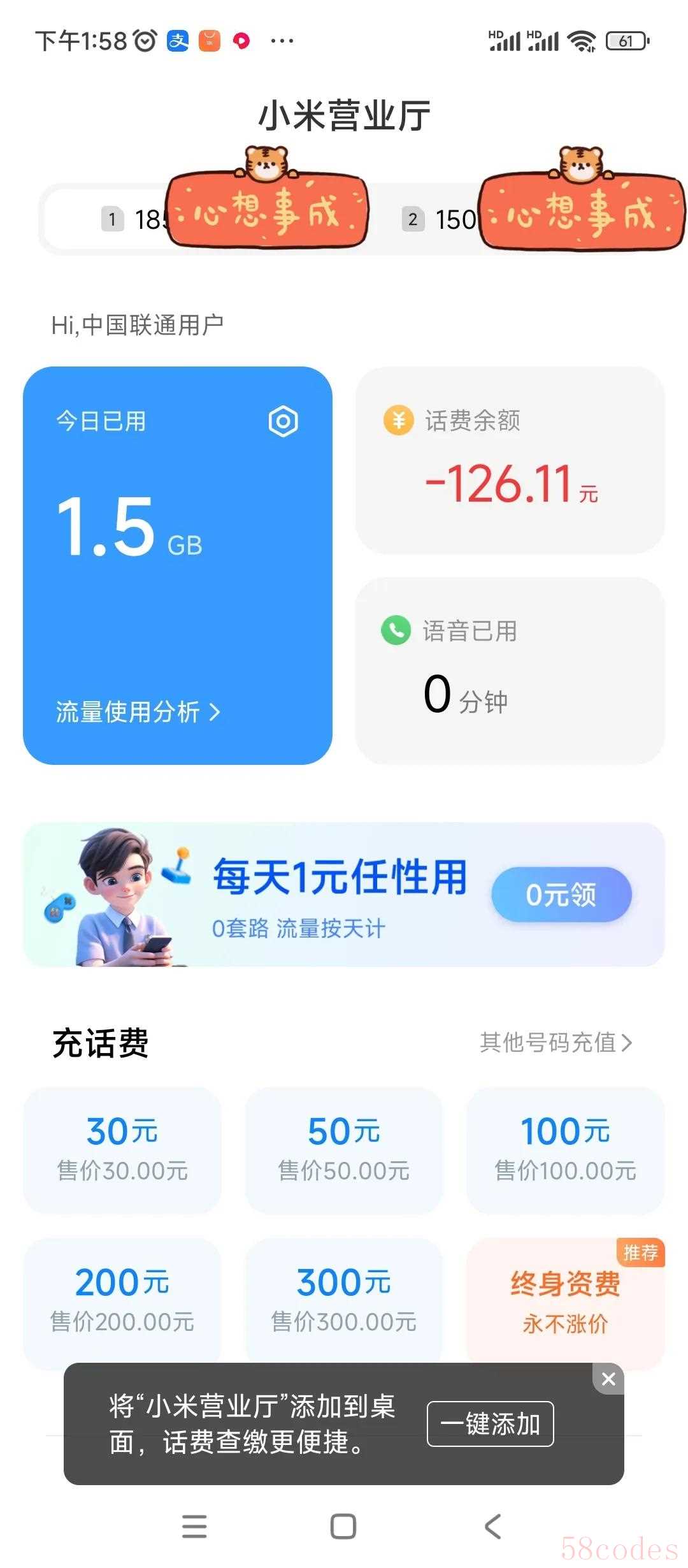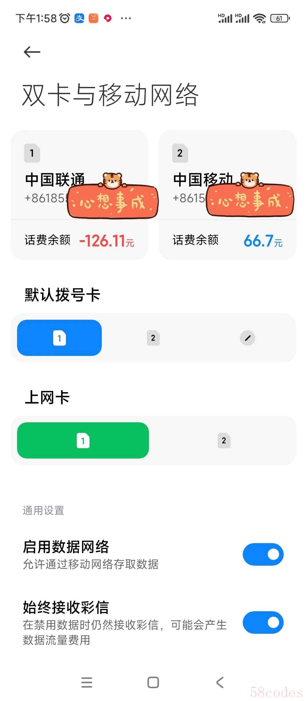 这里会显示我们的卡一和卡二,我有俩张卡,一张是联通,另外一张是移动,在这个页面会显示我们的话费余额,然后我们再点击话费余额进入,