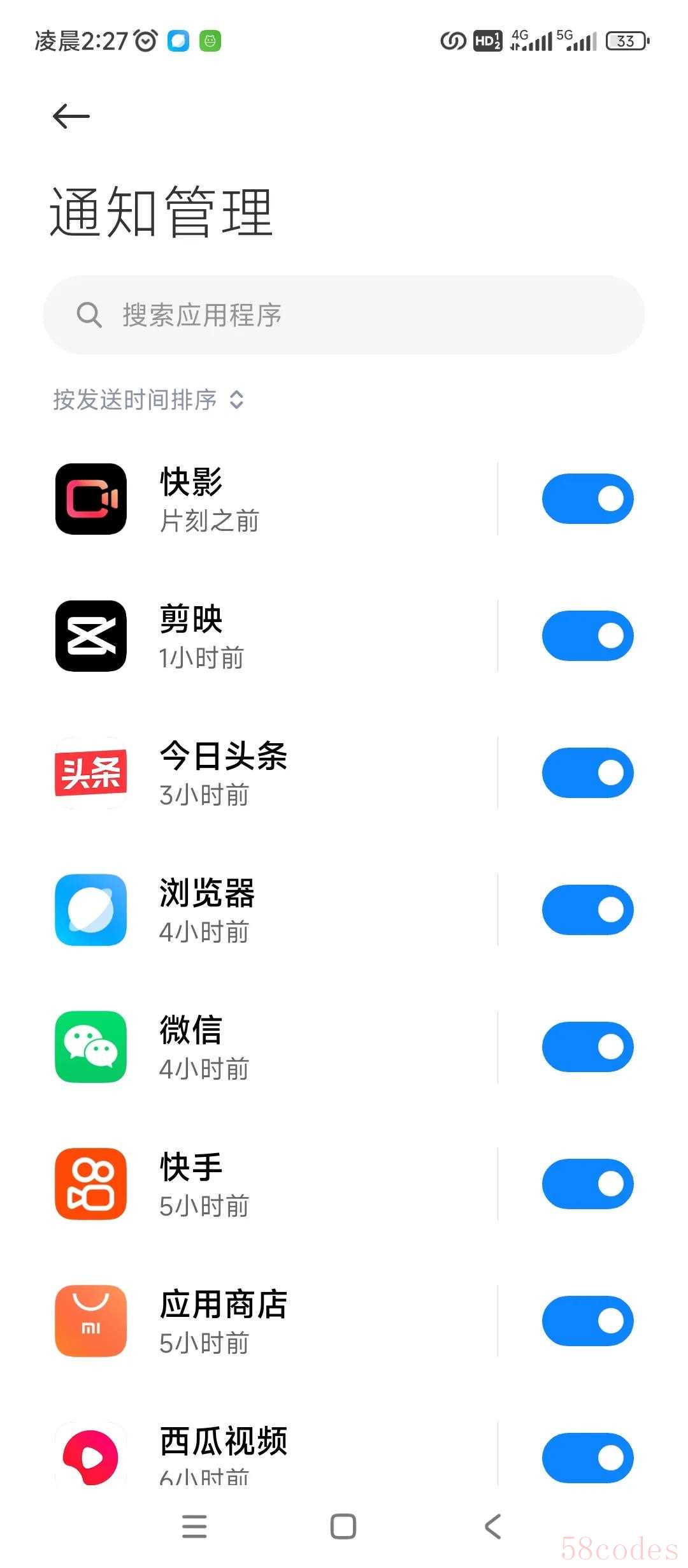 这里会显示我们手机安装的所有软件,有的软件我们不常用的时候,但是会时不时的给我们推送一些通知和广告,从而也会消耗我们的手机电量和话费流量,如果是我们不常用的软件,把他的这个通知开关通通的都关闭掉,但是平时常用的软件就不要关闭了,比如微信、今日、西瓜视频、抖音、等等常用的一些软件,你可以根据自己的需求去选择开启还是关闭。这一样一来也可以帮我们节省大量的手机流量。