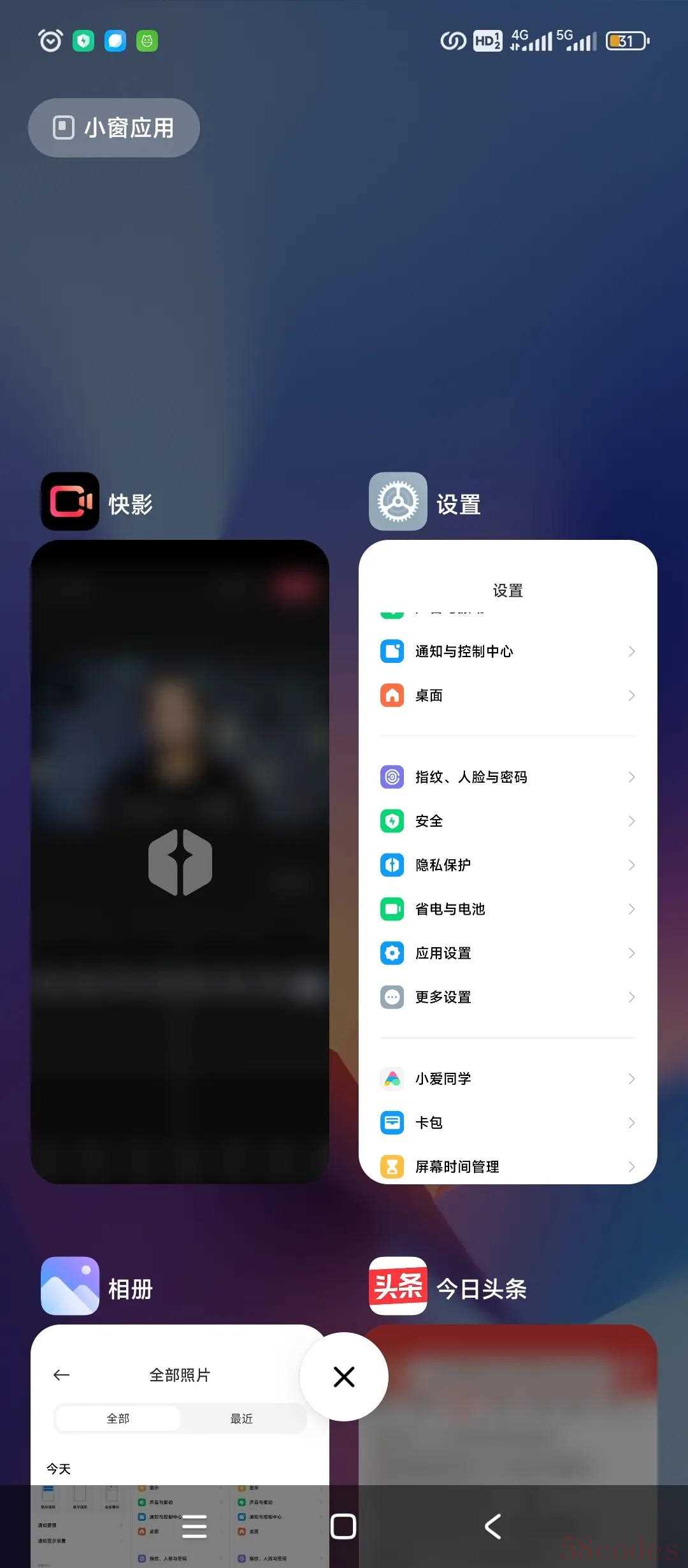 第五个开关:手机后台运行,我们每次浏览过一些手机软件的时候,我们点击一下手机底部左下角的三条杠,会显示我们刚才所有使用过的软件后台运行。