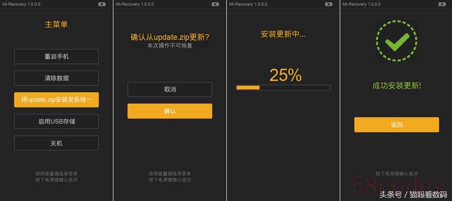 卡刷则需要通过MIUI网站下载对应机型的完整刷机包,然后将刷机包命名为“Update.zip”,放到手机存储空间的根目录,在通过设置--系统更新,点击右上角的“…”选择“重启到恢复模式(Recovery)”,点击“立即重启”,进入Recovery模式。