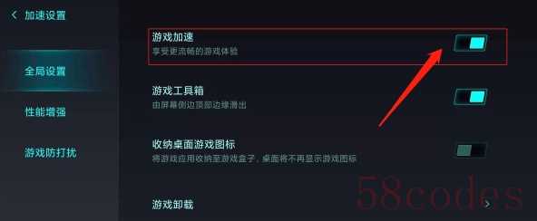 4. "关闭整体开关:" 找到“游戏加速”的整体开关(可能是一个全局开关,或者“开启游戏加速”的复选