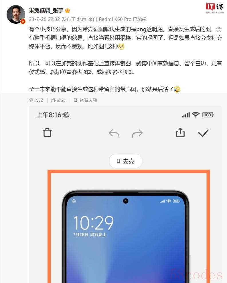 不过,该工具生成的图片四周没有留白,手机壳会直接贴在边框上。张宇给出了一个技巧,那就是在带壳截图界面再次截图,自行添加白边。