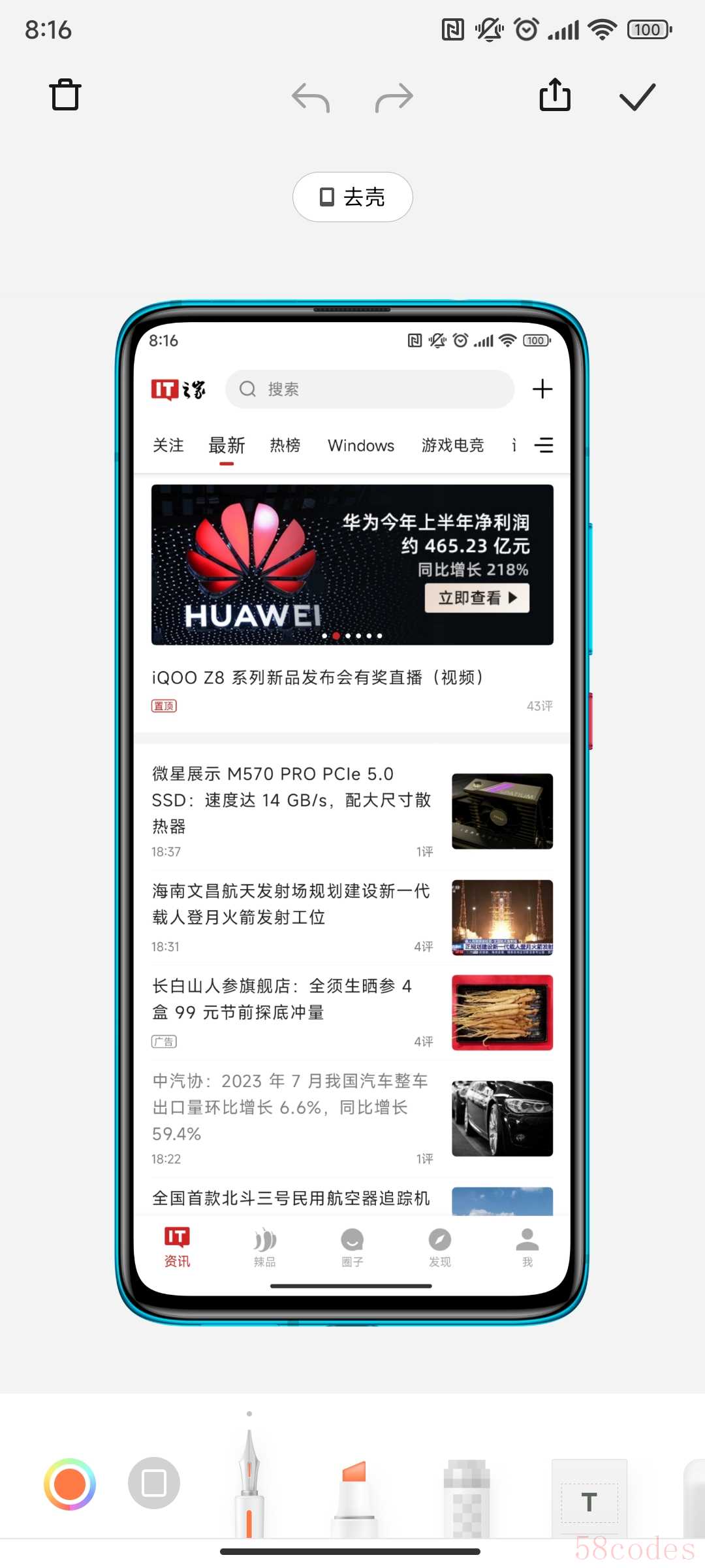 IT之家测试,小米、Redmi 手机截图后点击上方的“带壳”按钮,即可一键嵌套对应机型的手机壳,无需再下载其他 App 手动制作。