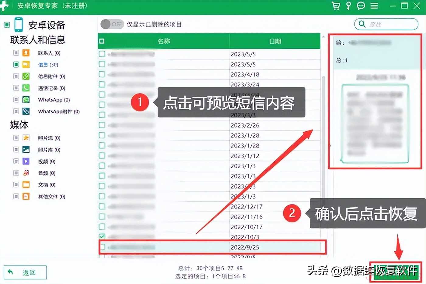 第三步:扫描完成之后我们就可以查阅我们手机里的短信内容了,点击可预览短信内容,确认是不是要恢复,确认好之后点击右下角可一键恢复!