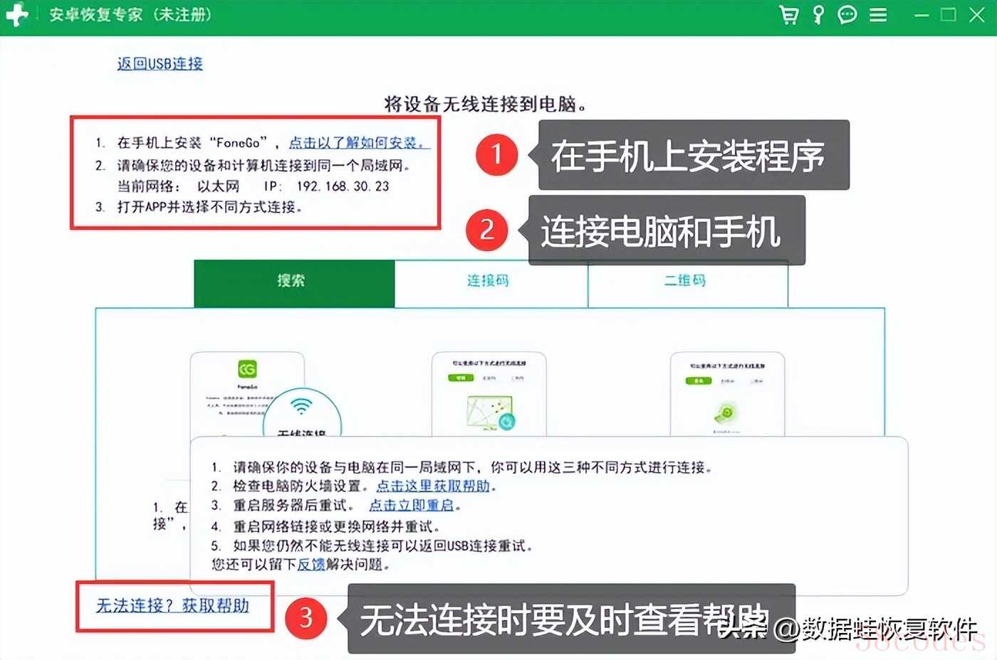 第一步:电脑上下载【数据蛙安卓恢复专家】软件,安装完成后,根据指示在手机上下载相应程序,然后连接手机和电脑,如果连接不上要及时更改连接方式或者查看帮助哦!