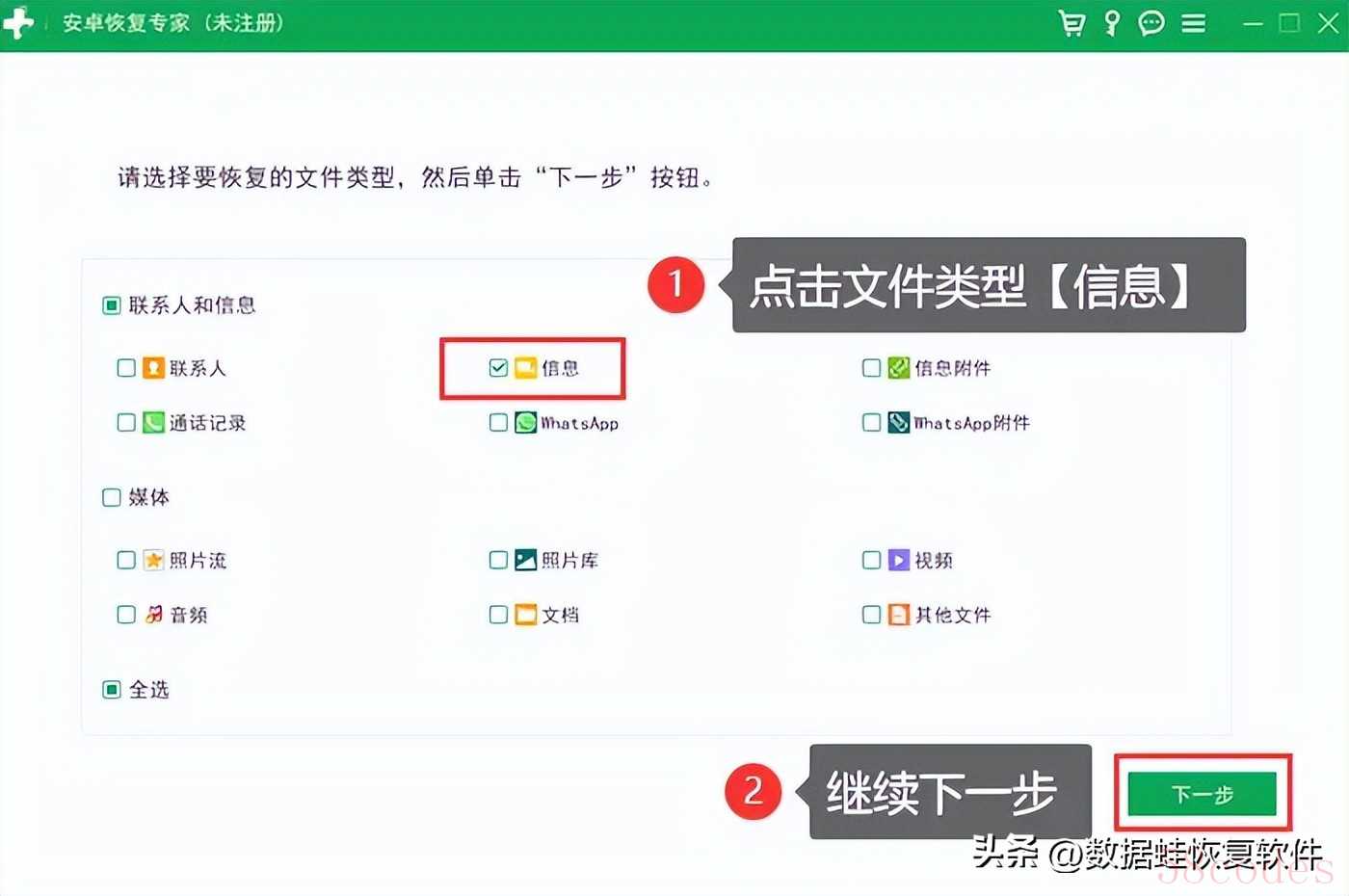第二步:连接完成之后就可以选择文件类型啦,我们要恢复的是手机短信,所以勾选【信息】这一项,点击下一步就好啦!