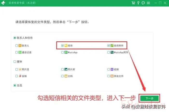 第二步:连接完成后在电脑上选择与手机短信相关的文件类型,例如【信息】和【信息附件】,选择完成后点击下一步,软件就会扫描设备数据啦!