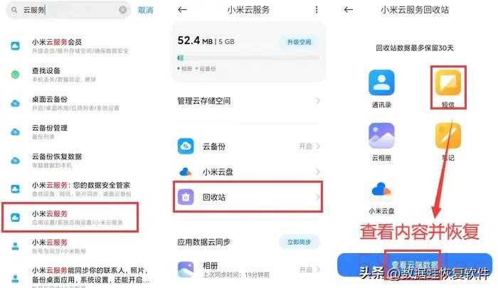 第二步:在云服务中找到【回收站】,进入选择【短信】即可查看备份过的短信内容并且恢复到手机。