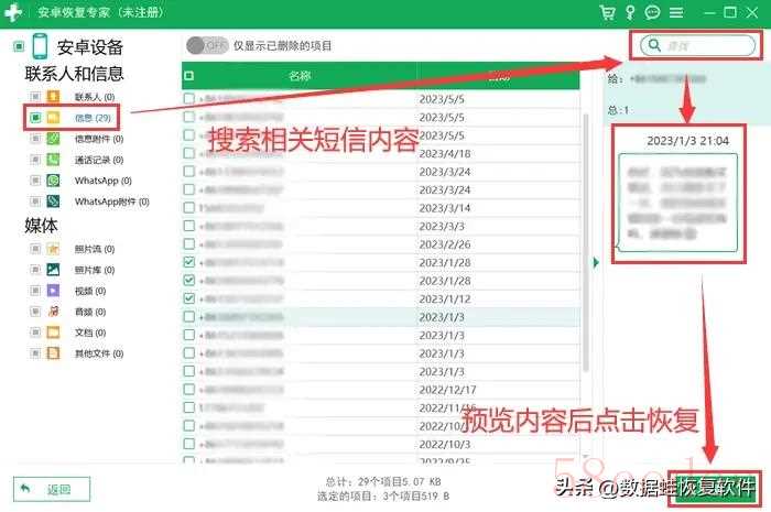有的手机系统没有回收站功能,或者已经过了回收站保存的时间,那么短信删除了怎么恢复?还能够恢复吗?这时候需要使用专业的数据恢复软件来尝试找回短信了,市面上有许多数据恢复软件可供选择,比如小编正在使用的这一款【数据蛙安卓恢复专家】软件,它能够深度扫描我们的手机,极大概率能够找出被误删的短信并恢复。以下是小编的使用方法: