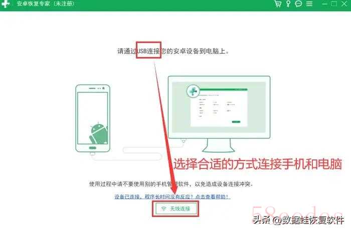 第一步:安装完成后,按照提示选择合适的方式连接手机和电脑。这里小编使用的是USB有线连接,接收更快更稳定!
