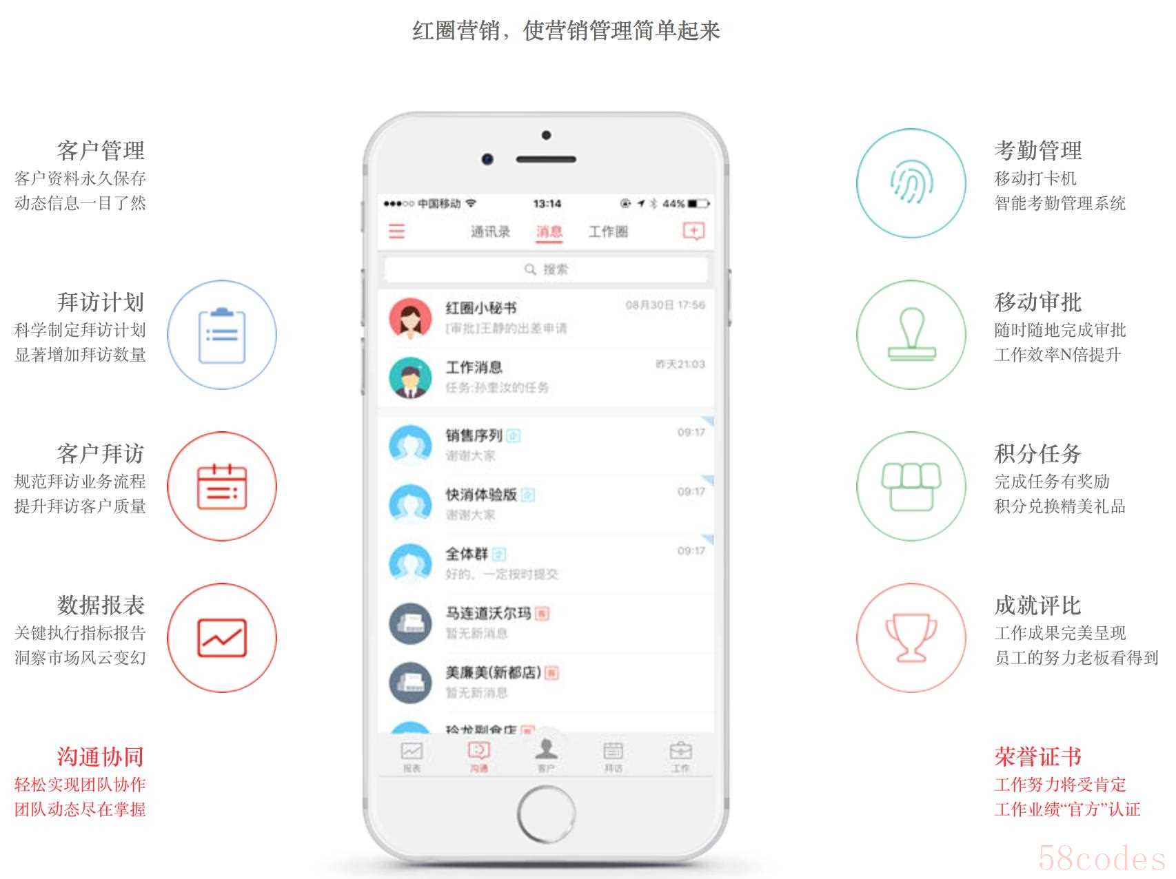 而红圈营销的普通版本,有包括客户信息、拜访计划、数据报表、数据决策、考勤管理、移动审批、沟通协同等主要模块的功能,除此之外,还有更多细分的模块应用。