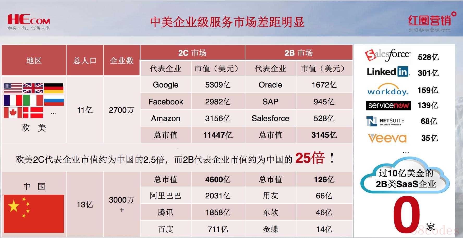 另外,跟欧美国家的企业相比,中国改革开放才30多年,整体的信息化水平处于相对落后阶段。尽管随着时代的发展企业内部逐渐互联网化,但很多企业还是不太清楚公司究竟需要什么样的企业级服务,即使是一直做销售的很多传统公司,也不太了解像红圈营销这样的软件应用服务能为工作带来的效率的明显提升。