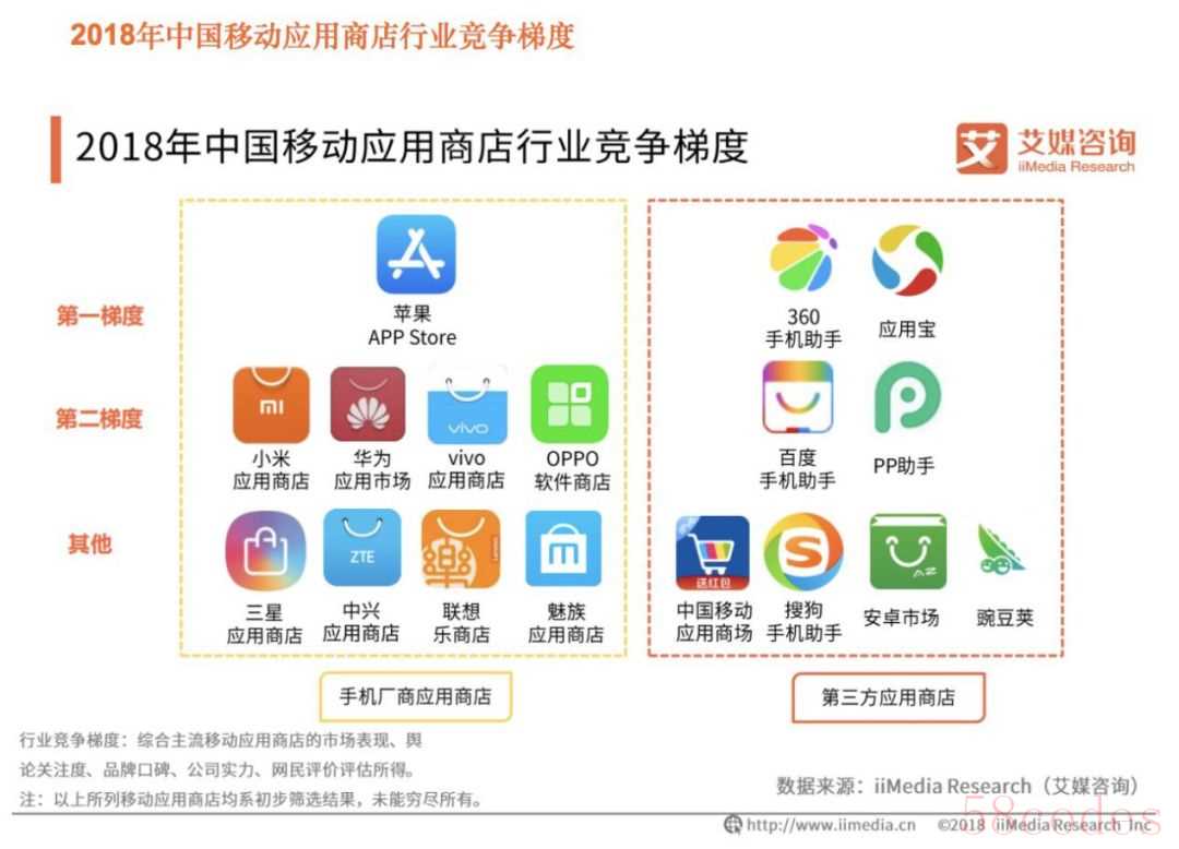 2018年,手机厂商应用商店中,苹果位居第一梯度,华米OV同属第二梯度;第三方应用商店中,360手机助手、应用宝占据第一梯度,百度旗下百度手机助手、PP助手同处第二梯度。