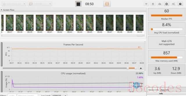 麒麟990 5G SoC的强悍还体现在性能上。游戏测试环节,《王者荣耀》开启最高画面设置,Gamebench实时帧率稳定在60帧,麒麟990 5G令人惊喜的地方在于全程稳定的帧率显示,基本没有出现掉帧或者帧率波动的情况。