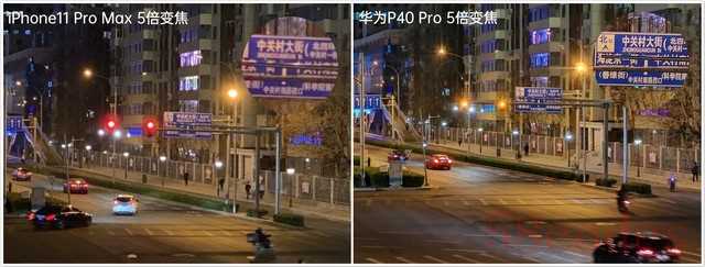 iPhone11 Pro Max最大支持10倍变焦,但在10倍变焦的情况下,实际的道路指示牌字体已经模糊掉了,可以说在实际的成像效果上,华为P40 Pro哪怕是在10倍变焦的情况下仍旧可以通过极为强悍的软硬件素质还原夜景应有的样子。