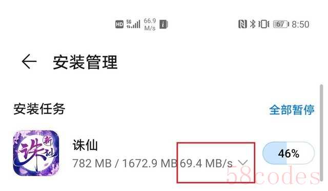 5G网络环境下,华为P40 Pro 5G软件下载速度表现也是极为优秀的,稳定在69MB/s左右,1.7GB大小的游戏,一分钟内下载完成。