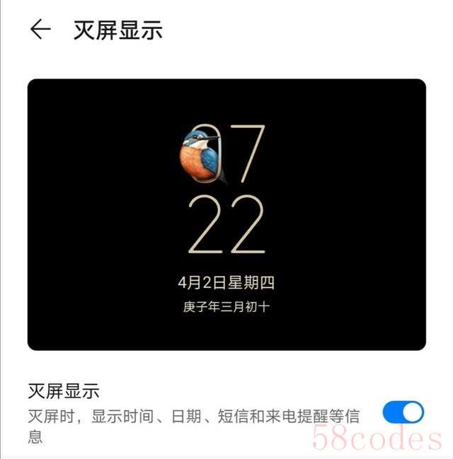 灭屏显示的设计上,华为设计了翠鸟AOD显示,具体的灵感来源是白居易的诗词“枝梢袅青翠,韵若风中弦。”我们能够看到这个息屏显示是通过数字和图片拆分图层,通过前景层、数字层、背景层三层叠加的设计,营造成前后立体景深的视觉感。