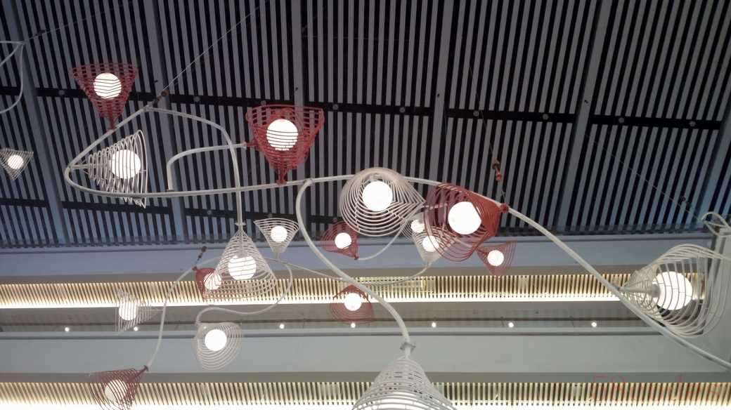 高高的条纹天棚和线条状的艺术灯,可以检验一下镜头畸变控制、景深层次展现、细节还原的效果。