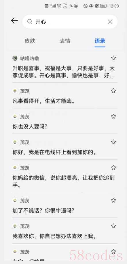 点击上图的“表情”,下方就会显示所有与“开心”相关的表情;点击“语录”,下方就会显示所有与“开心”相关的语录。