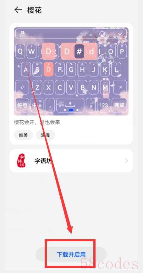 目前皮肤还不太多,但是随着开发者的加入,皮肤会越来越多的。然后怎么给小艺输入法安装皮肤呢?比方说,我们喜欢这个“樱花”皮肤,直接点击它,就会进入“樱花”皮肤下载界面(如下图)。