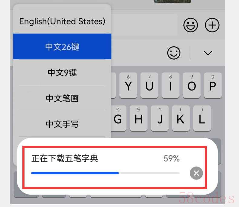 在列表中我们可以看到新增了一个“中文五笔”,点击这个“中文五笔”,同样也能切换到五笔输入法。第一次使用小艺输入法的五笔功能时,手机会自动下载“五笔字典(如下图),下载完成后,就可以使用了。