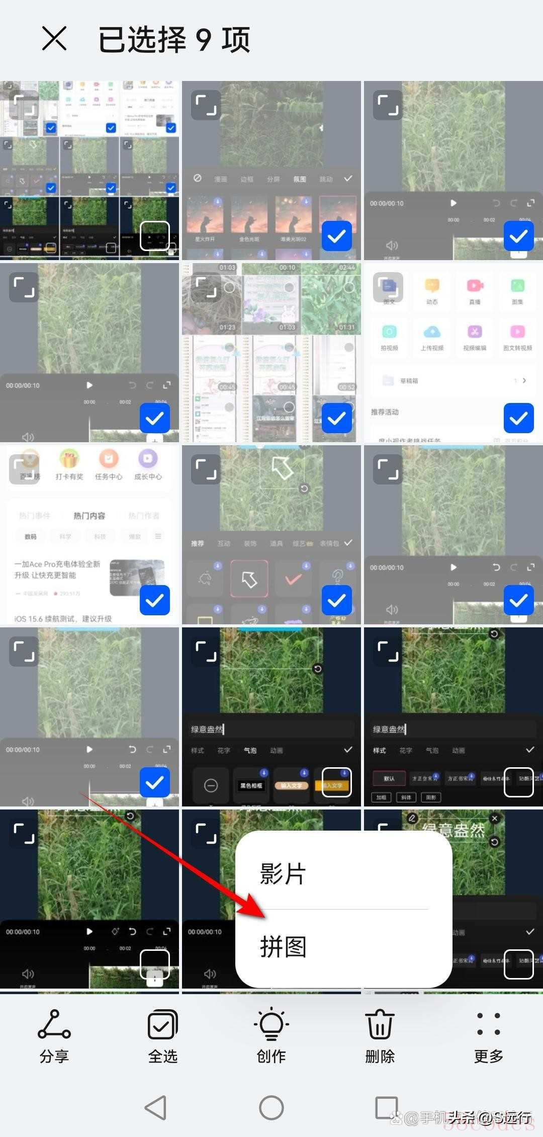打开华为手机图库相册,长按勾选需要弄成九宫格的图片,点击“创作”图标。
