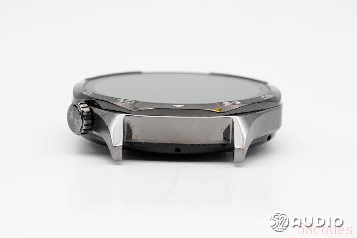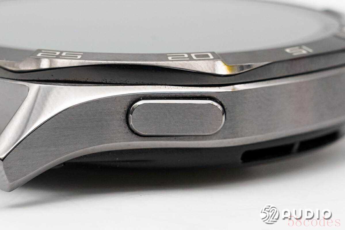 表盘右侧外观一览,中框采用了不锈钢材质,拉丝工艺处理,边缘打磨亮面倒角。表盘右侧设置有旋转表冠和一颗快捷按键,底部盖板上有扬声器出音孔。
