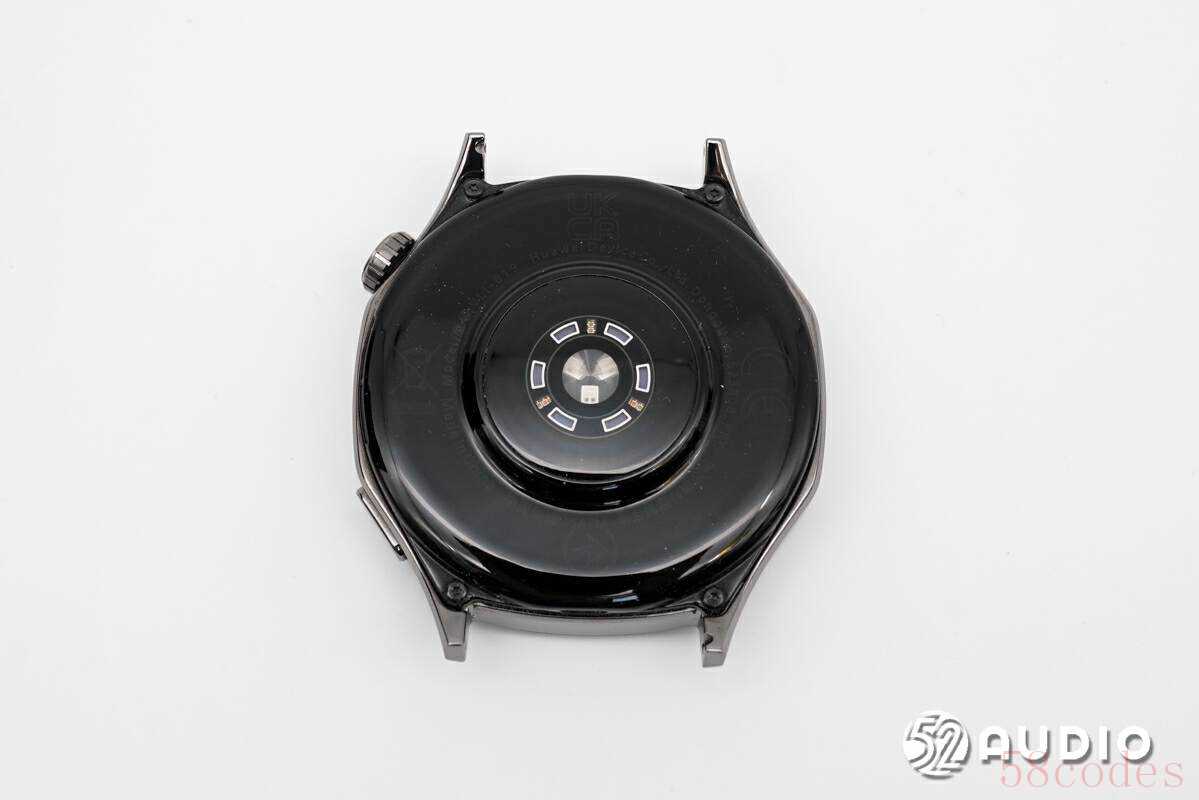 表盘背面外观一览,盖板质感温润,佩戴舒适贴肤;中间传感器模组微微凸起,更好地贴合皮肤监测。