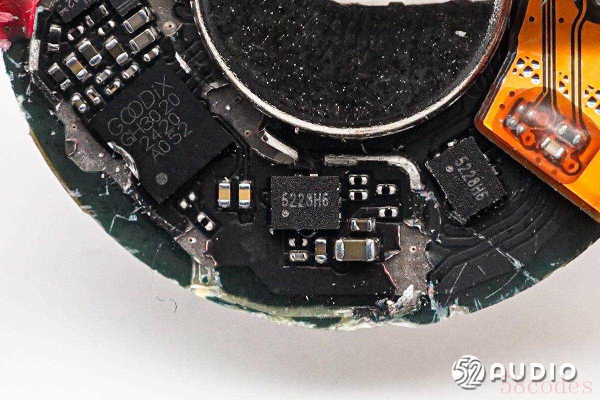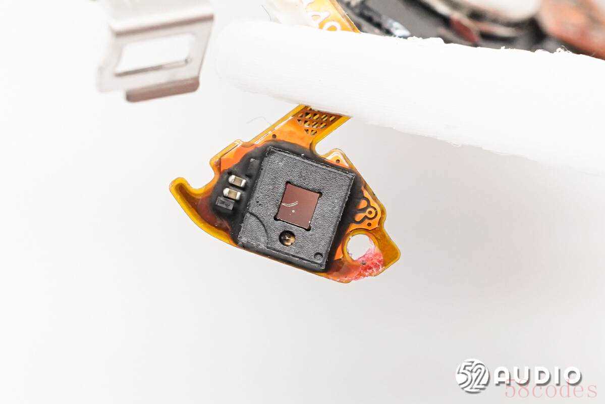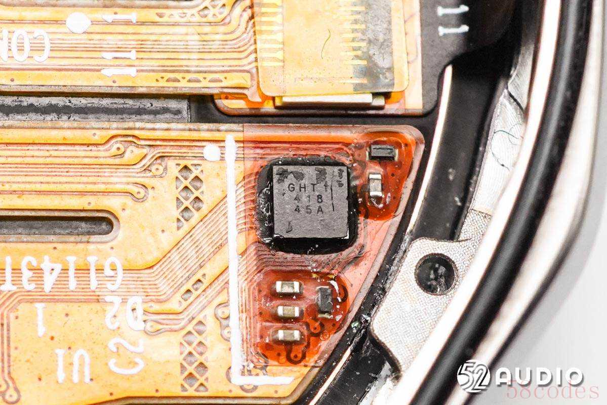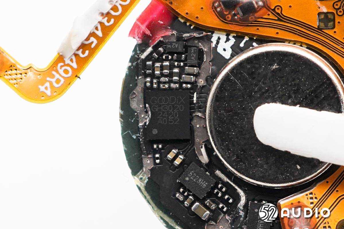 拆掉小板上的屏蔽罩,下方健康监测IC采用了GOODiX汇顶科技GH3020方案,集成了多通道PPG,具备心率、心率变异性和血氧饱和度等监测功能。