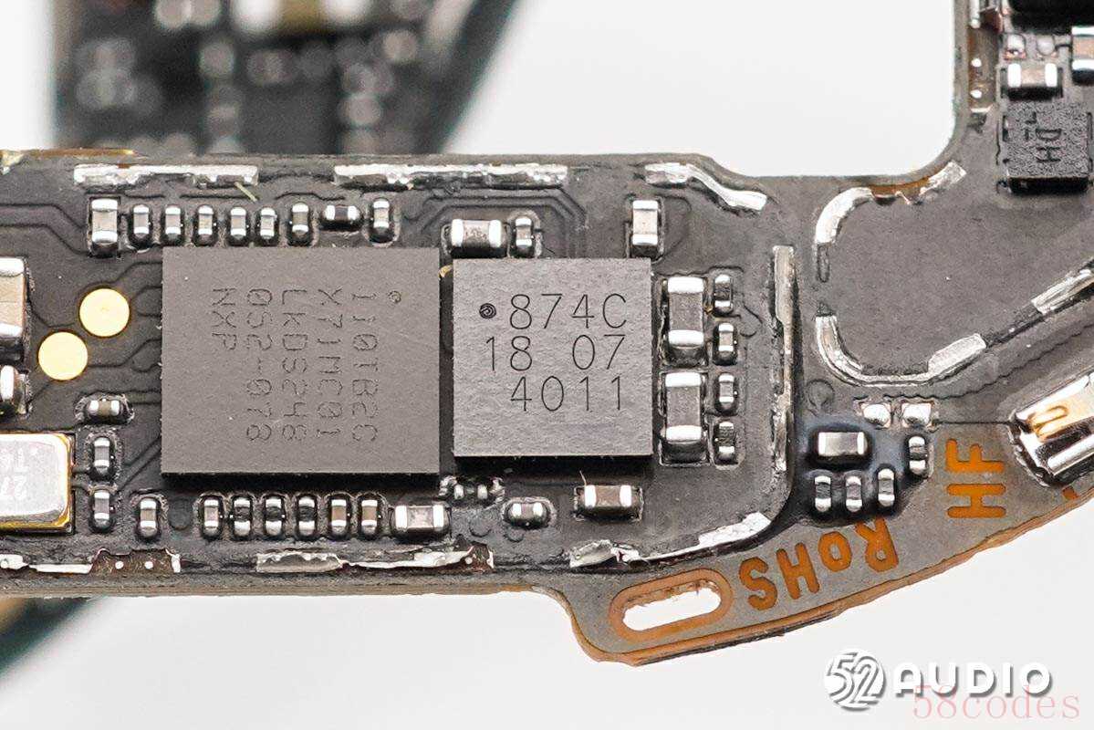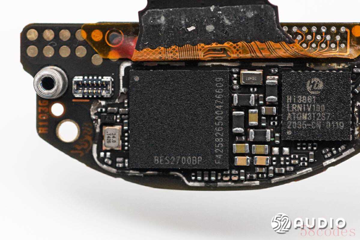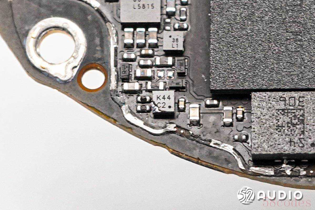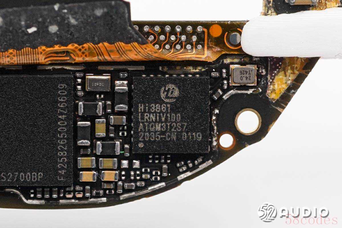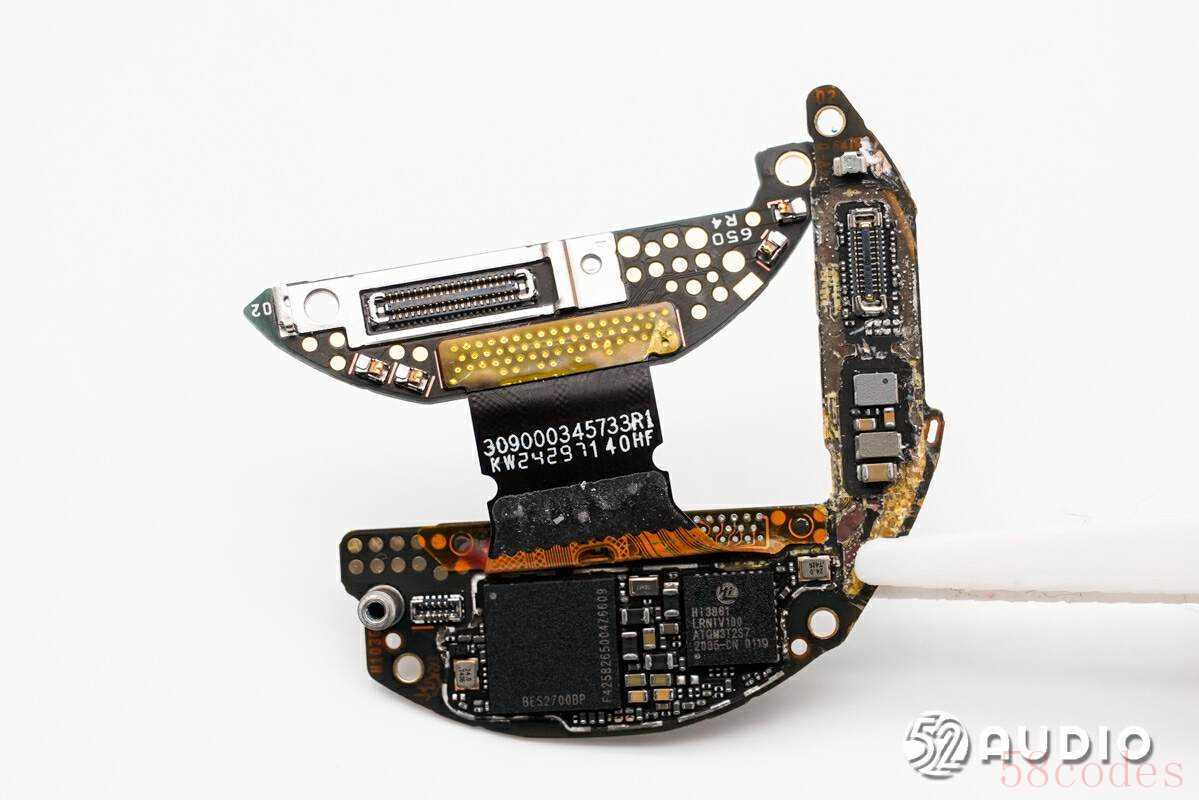 主板上,搭载了BES恒玄BES2700BP单芯片RTOS手表SoC,HiSilicon海思Hi3861V100 2.4GHz SoC WiFi芯片,ST意法半导体LSM6DSOWTR 6轴传感器,Renesas瑞萨DA9168电池充电管理芯片,NXP恩智浦的NFC芯片等;其他还采用了多颗Sunlord顺络电子SDCL系列叠层陶瓷电感等元器件。