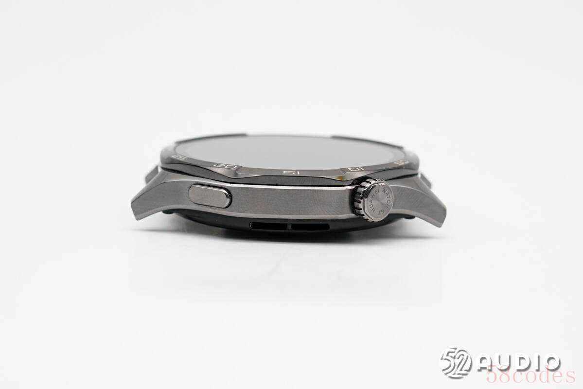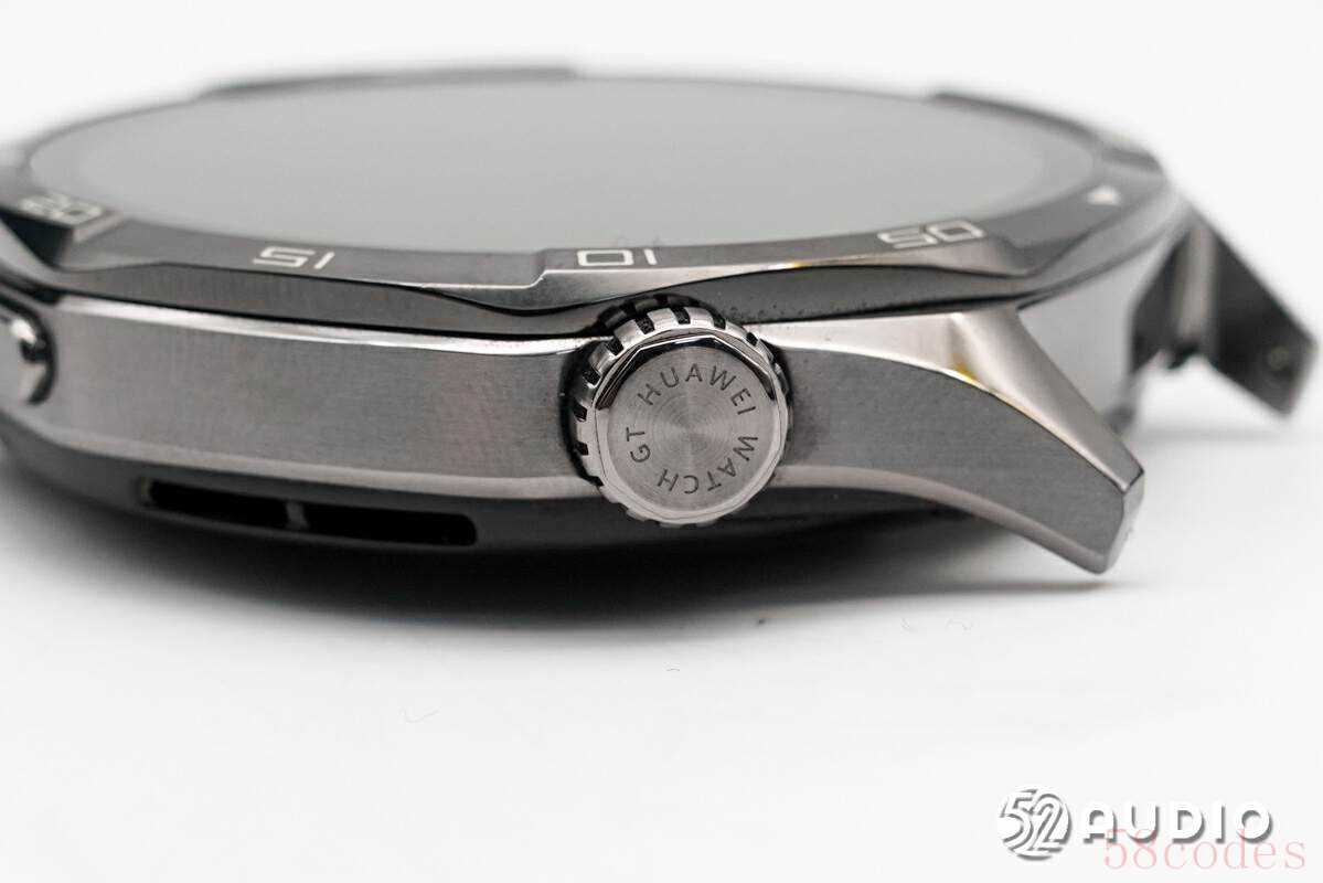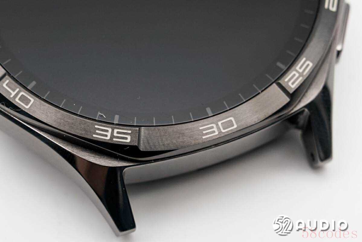旋转表冠特写,背部CD纹理设计,环刻“HUAWEI WATCH GT”字样;边缘齿纹相较于上代更大更深。
