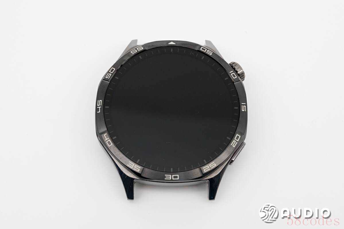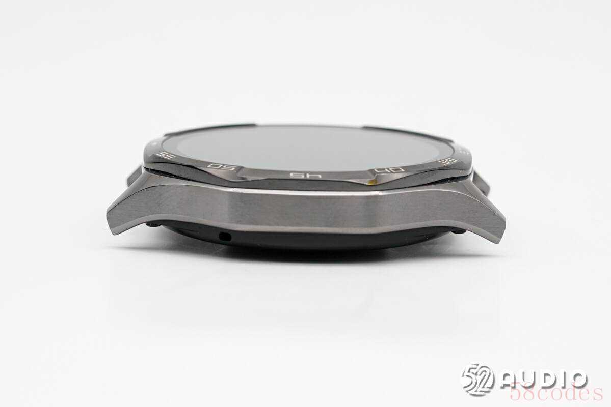 表盘正面外观一览,采用了1.43英寸AMOLED屏,屏幕边缘设计刻度,降低黑边的视觉效果。屏幕表圈作了优化,由上代的圆形改为了与中框相同的8角菱形,并且采用了叶形切面设计,亮面棱角,折射璀璨光芒,使观感更加和谐精致。