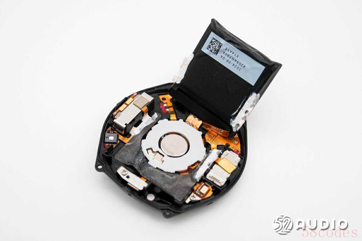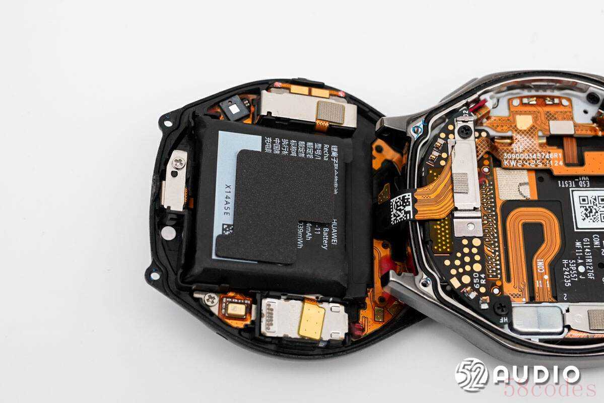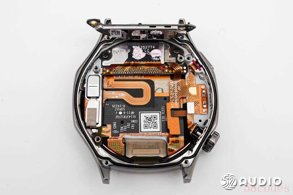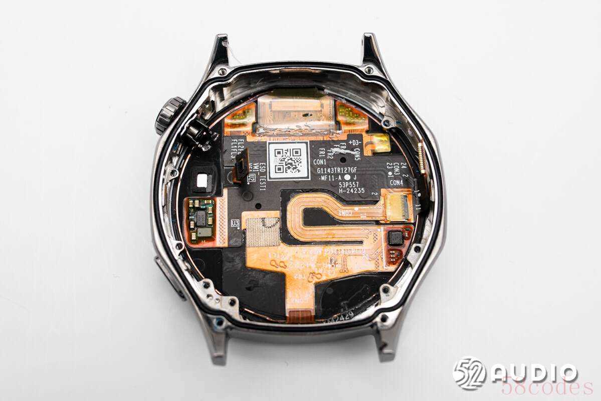 "初步拆解:" 智能手表的拆解通常从后盖开始。GT5系列的后盖设计可能采用螺丝固定或卡扣+螺丝的组合。拆卸后盖后,可见电池、主 PCB 板(PCB)以及各种传感器和天线模块。GT5