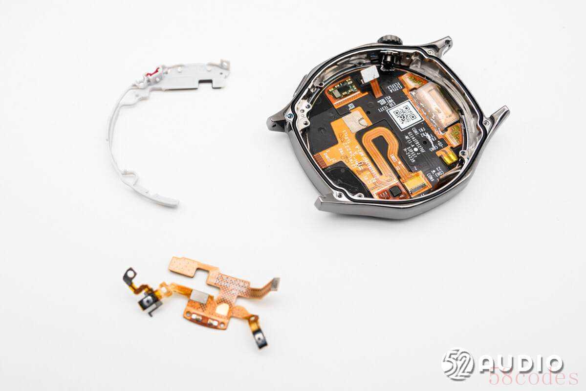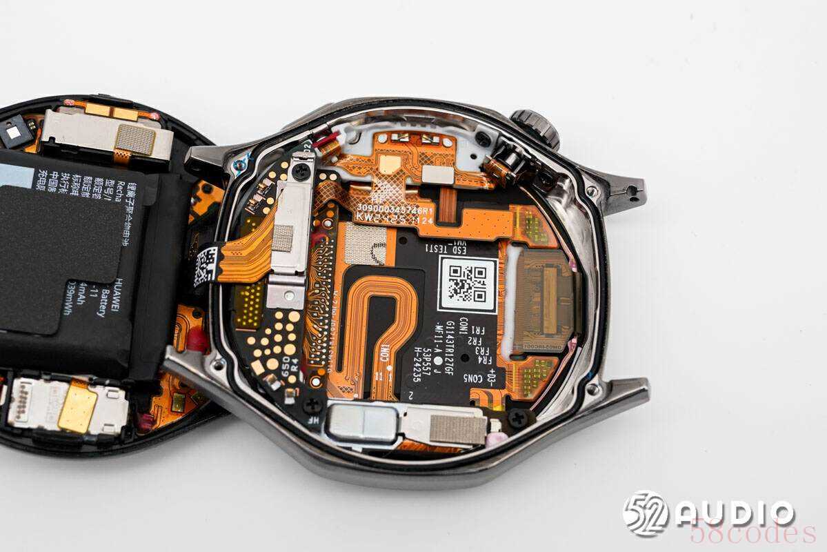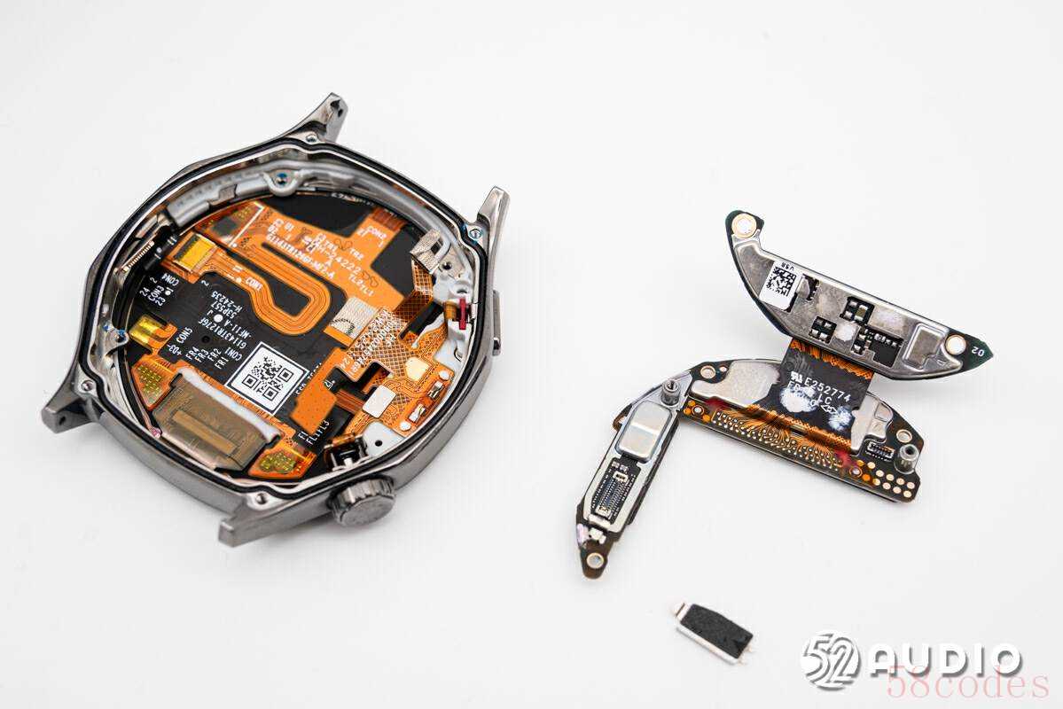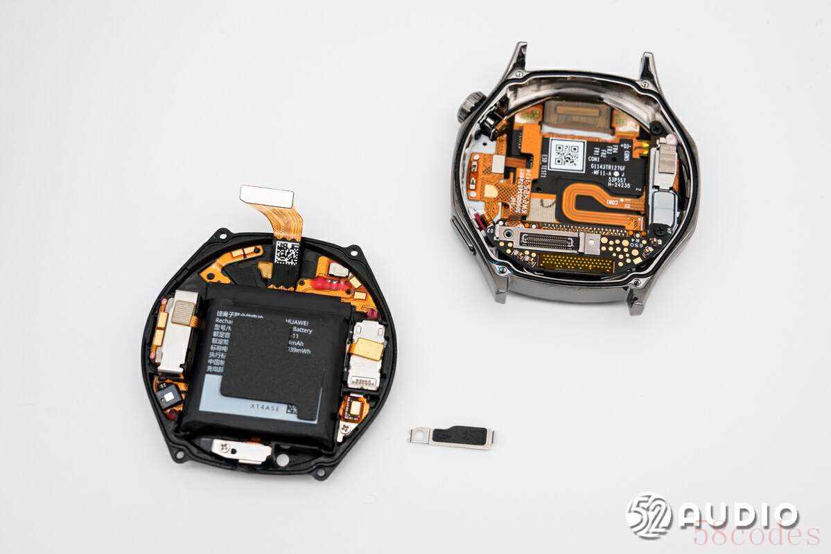 内部主要配置方面,搭载了524mAh锂离子聚合物电池,内置扬声器、麦克风、线性振动马达和气压计,采用了12通道的光电传感器和GOODiX汇顶科技GH3020健康监测IC,用于心率、血氧等多项人体健康指标监测。