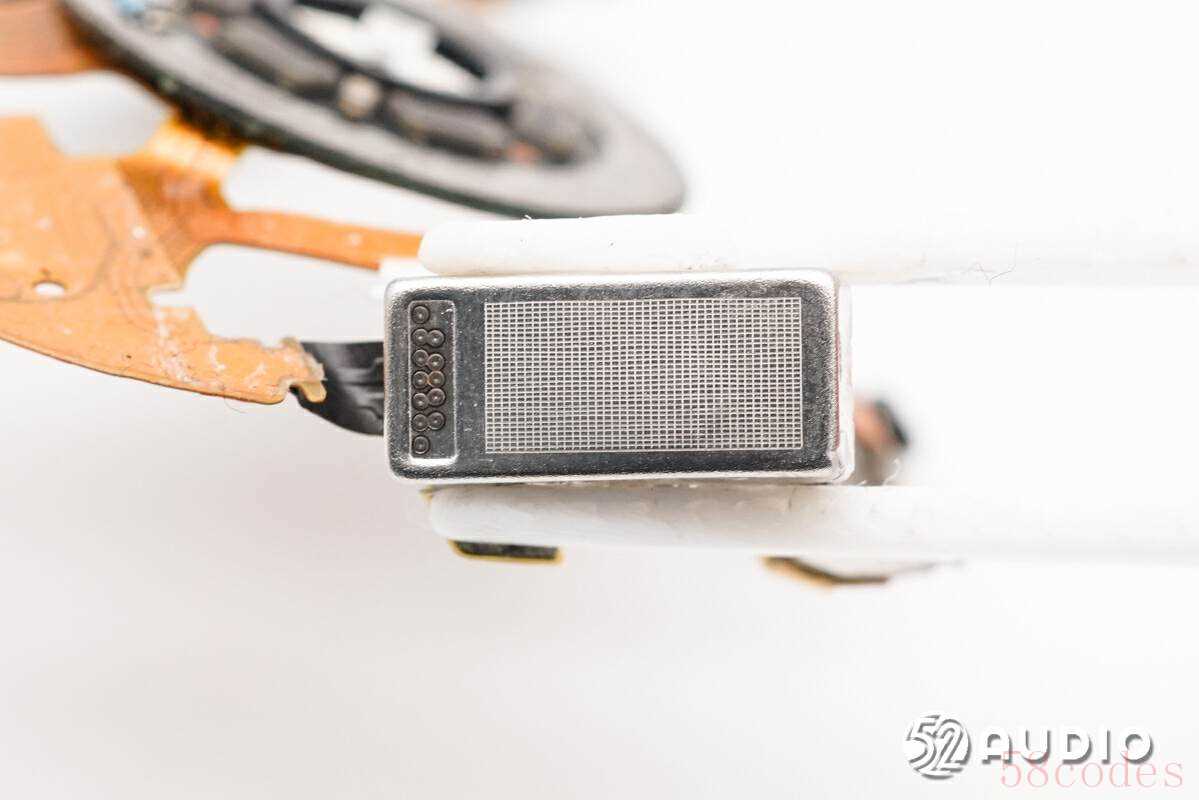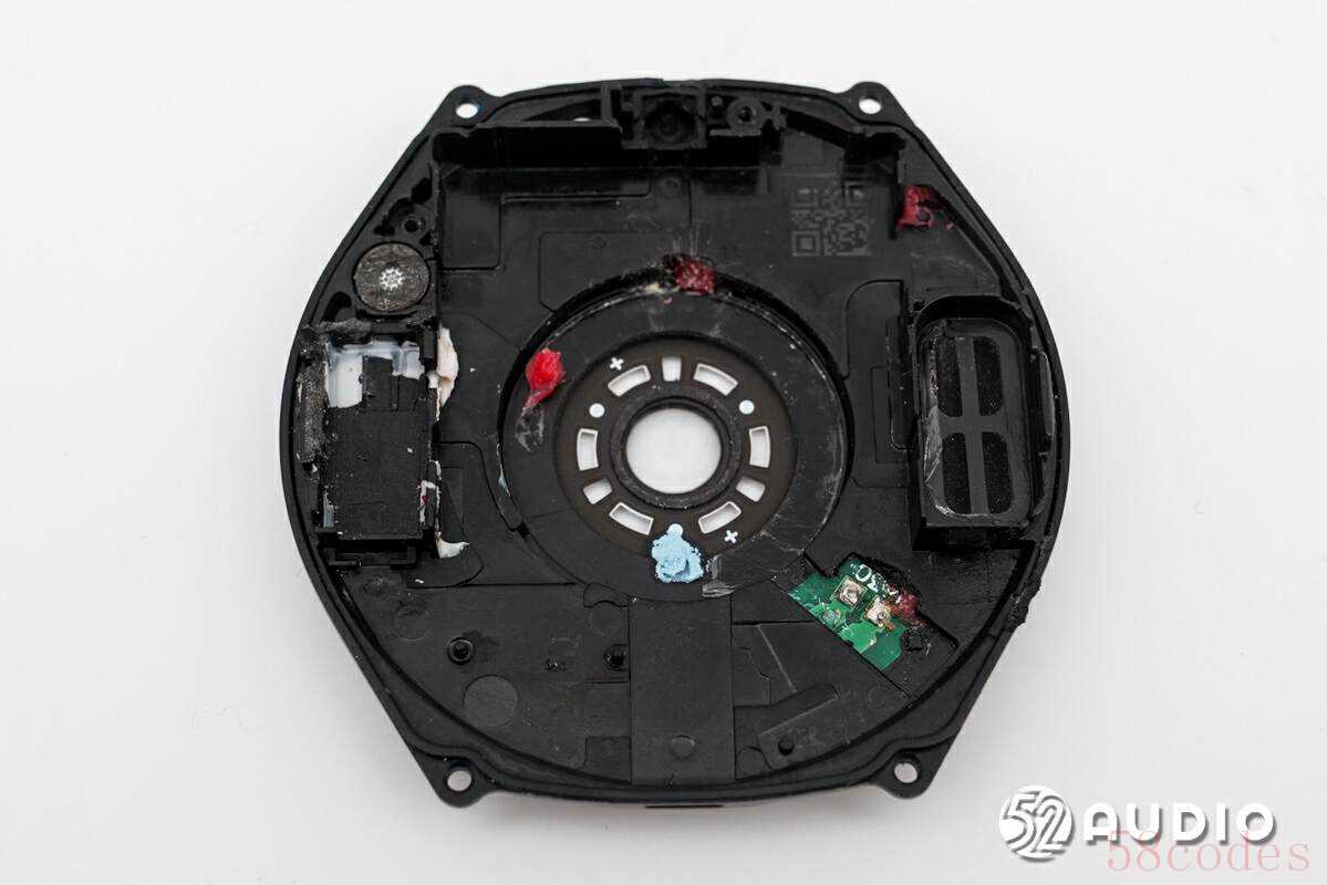 盖板内侧结构一览,中间固定有电池单元,四周设置扬声器、麦克风、振动马达等元器件。