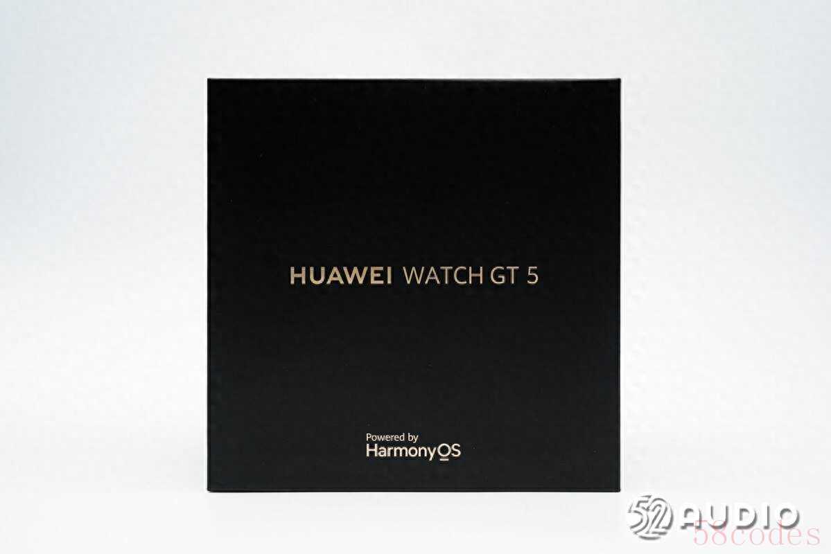 HUAWEI华为WATCH GT5智能手表包装盒采用了非常具有质感的黑金配色,顶部烫金设计产品名称和Harmony OS系统标志。