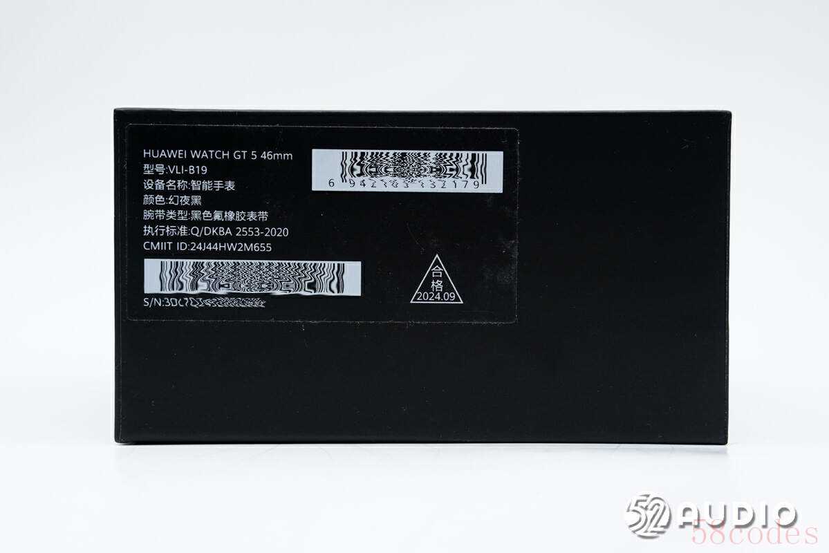 另外一侧贴有产品标签,HUAWEI WATCH GT5 46mm,型号:VLI-B9,设备名称:智能手表,颜色:幻夜黑,腕带类型:黑色氟橡胶表带。