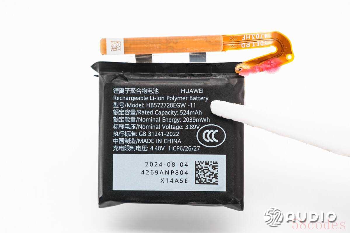 手表内置锂离子聚合物电池,型号:HB572728EGW-11,额定容量:524mAh,额定能量:2039mWh,标称电压:3.89V,充电限制电压:4.48V,中国制造。