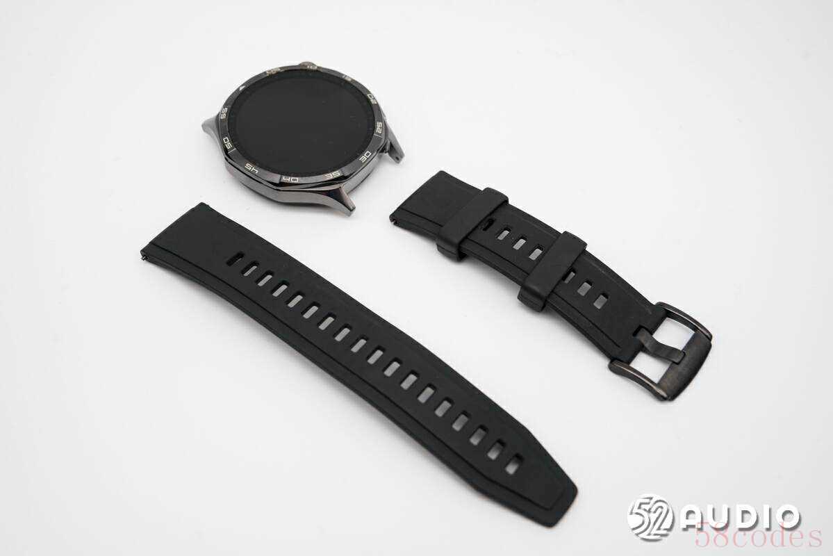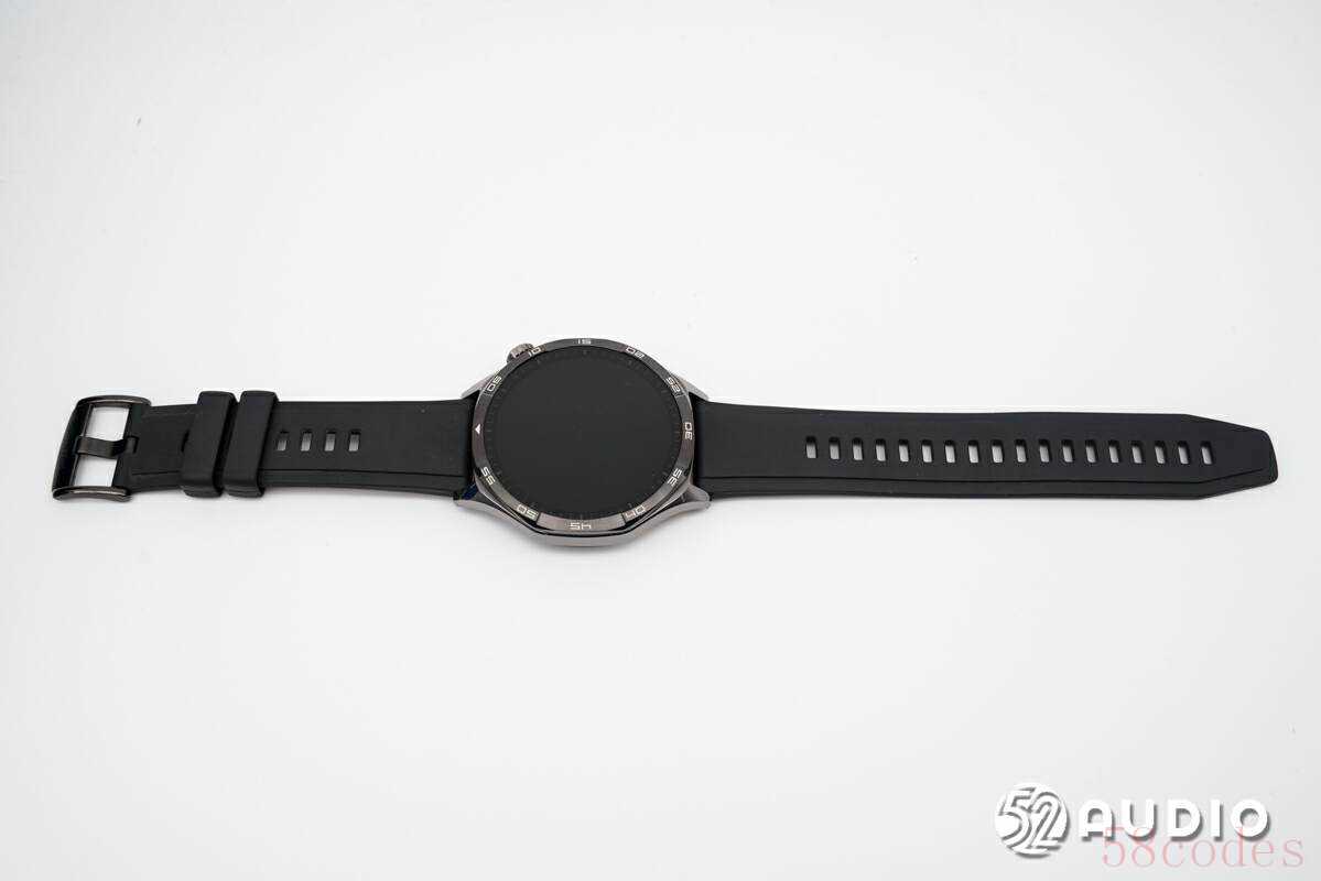 华为WATCH GT5智能手表外侧外观一览,圆形表盘,八角菱形表圈。氟橡胶表带,采用了金属针型表扣,双表带箍,佩戴舒适稳定。
