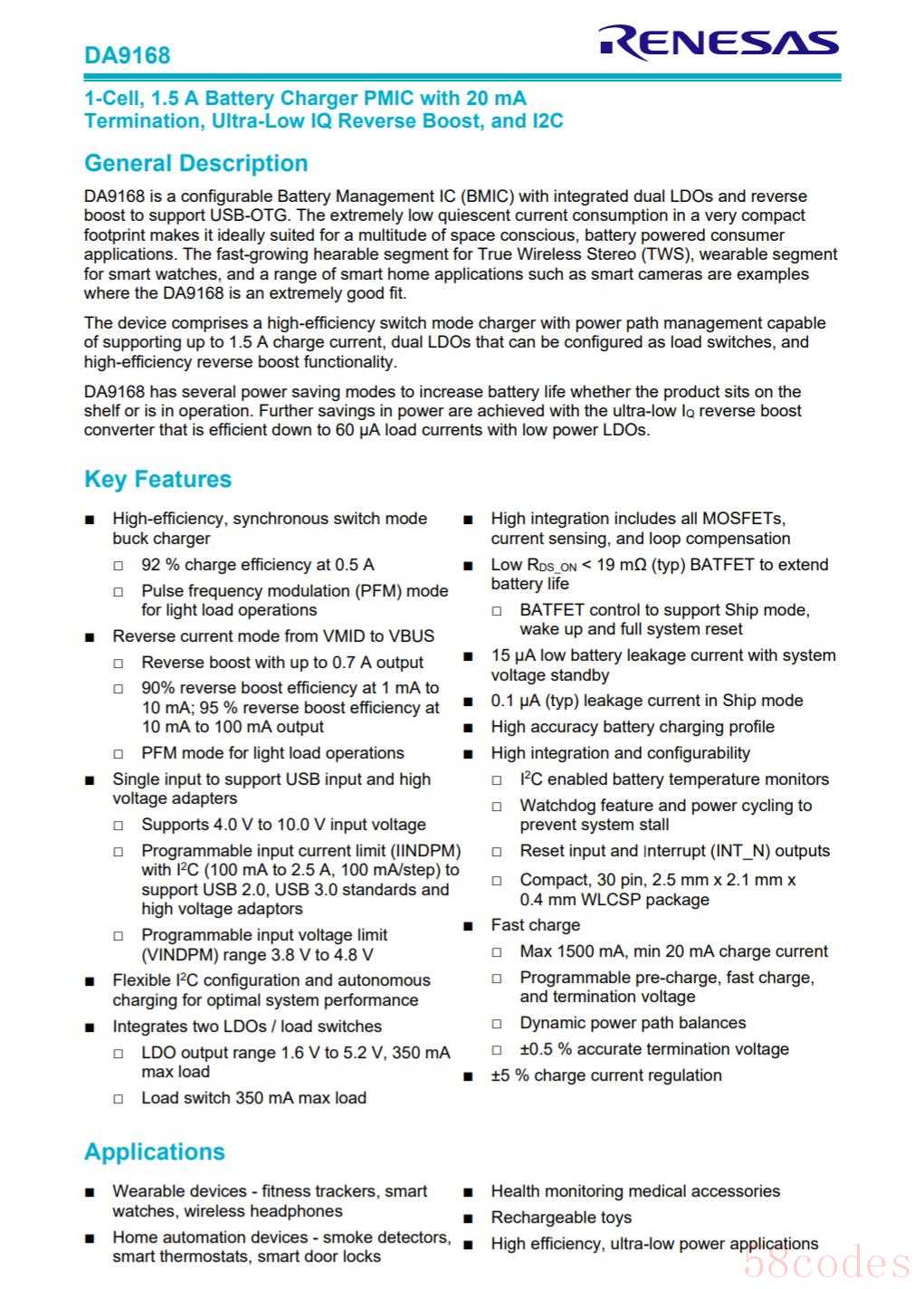 Renesas瑞萨DA9168电池充电管理芯片,内置双路独立LDO和反向升压功能,可支持USB On-The-Go(USB-OTG)标准,具有极低的静态电流消耗和非常紧凑的占位面积,使其非常适合大量注重空间的电池供电消费类产品应用。