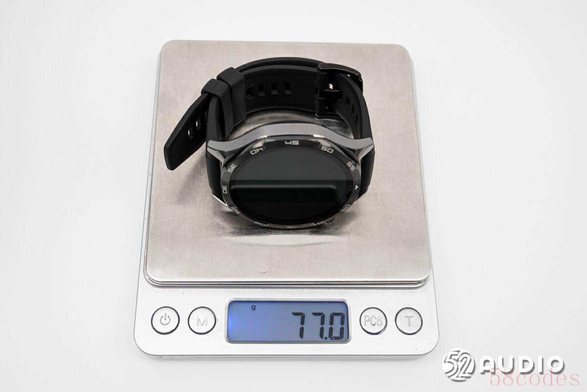 经智研所实测,HUAWEI华为WATCH GT5智能手表46mm版本,氟橡胶表带,整机重量约为77.0g,佩戴有一定的分量感。