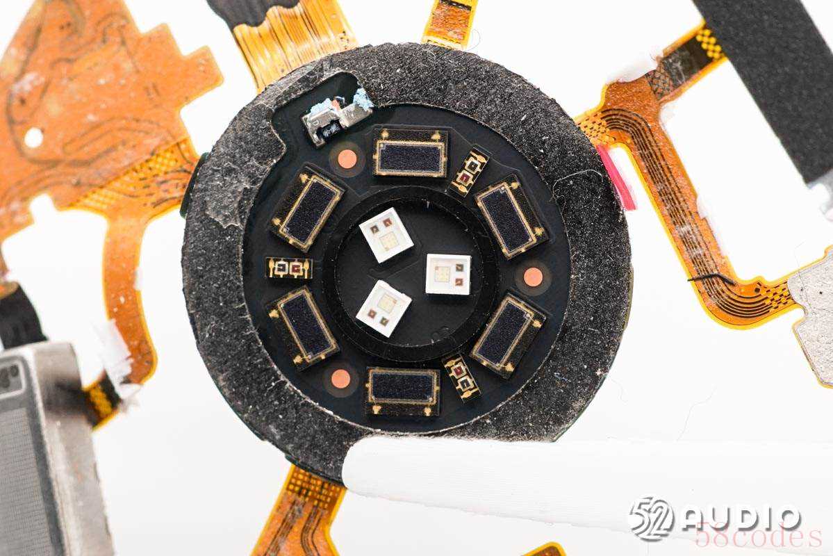 健康监测传感器模组特写,包括6个12通道的光电传感器,以及6颗分布设置的发光源。